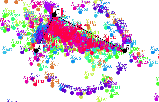 這些只是數學家克拉克·金伯林從埃文斯維爾大學彙編的三角中心中的四個(實際上是前四個)。Kimberling (1994) 中出現了 301 個(加上額外的 13 個)中心,Kimberling (1998) 中出現了 360 箇中心,但 Kimberling 繼續在他的“三角中心百科全書”中線上彙編中心(在這項工作中稱為金伯林中心)。該列表最近進行了一次重大更新,總共包含 2676 個三角中心(其中一部分如上圖右側所示)。這些中心的子集可在 Mathematica 包 KimberlingCenters.m 中獲得(與 PlaneGeometry.m 結合使用,均由 Eric Weisstein 編寫),並且由於 Edward Brisse 博士將中心轉錄到 Mathematica 中的工作,整個 ETC 的三線座標應該很快可用。